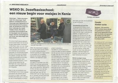 Inmiddels hebben al zeven scholen actie gevoerd voor weesmeisjes in Kenia. In maart heeft WSKO Jozefschool in het kader van hun project "een nieuw begin" statiegeldflessen ingezameld. WSKO Joannesschool heeft The Lion King opgevoerd in de Ontmoetingskerk en bij de verkoop van DVD's hiervan en een vrijwillige bijdrage bij de ingang, een prachtig bedrag opgehaald.