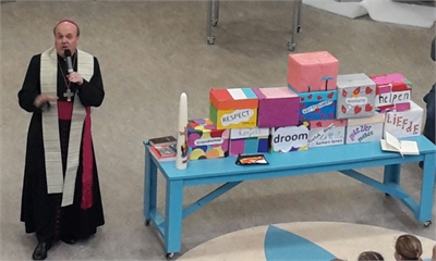 De dozen met de namen erop werden tot een muur gebouwd, zodat we niet alleen in een school zitten met stenen muren, maar ook met een muur waar betekenisvolle woorden opstaan. De ruimte van Rust had ook al dienst gedaan bij terugkomst van het kamp van groep 8. We hebben toen een kaarsje opgestoken, omdat iemand dat had verdiend. De kinderen gaven ook aan dat de ruimte gebruikt kan worden, als je aan iemand wil denken die er niet meer is of als je iets wil vieren dat je blij maakt. Ook kun je er gewoon een keer gaan zitten als je in deze wereld vol geluid een beetje rustiger wil zitten. De bisschop gaf als voorbeeld de telefoons en de tablets die constant om aandacht vragen.